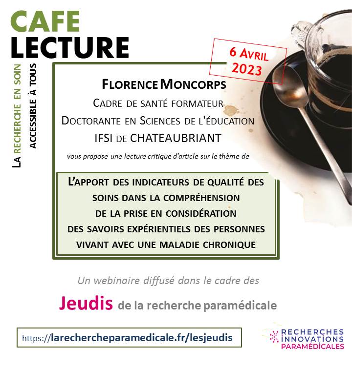 Le 6 avril 2023, Florence MONCORPS présentera une lecture critique de l’article » Des enquêtes de satisfaction aux patient-reported outcomes « . Minvielle, É., Fourcade, A., & Ferrua, M. (2019).Risques & Qualité