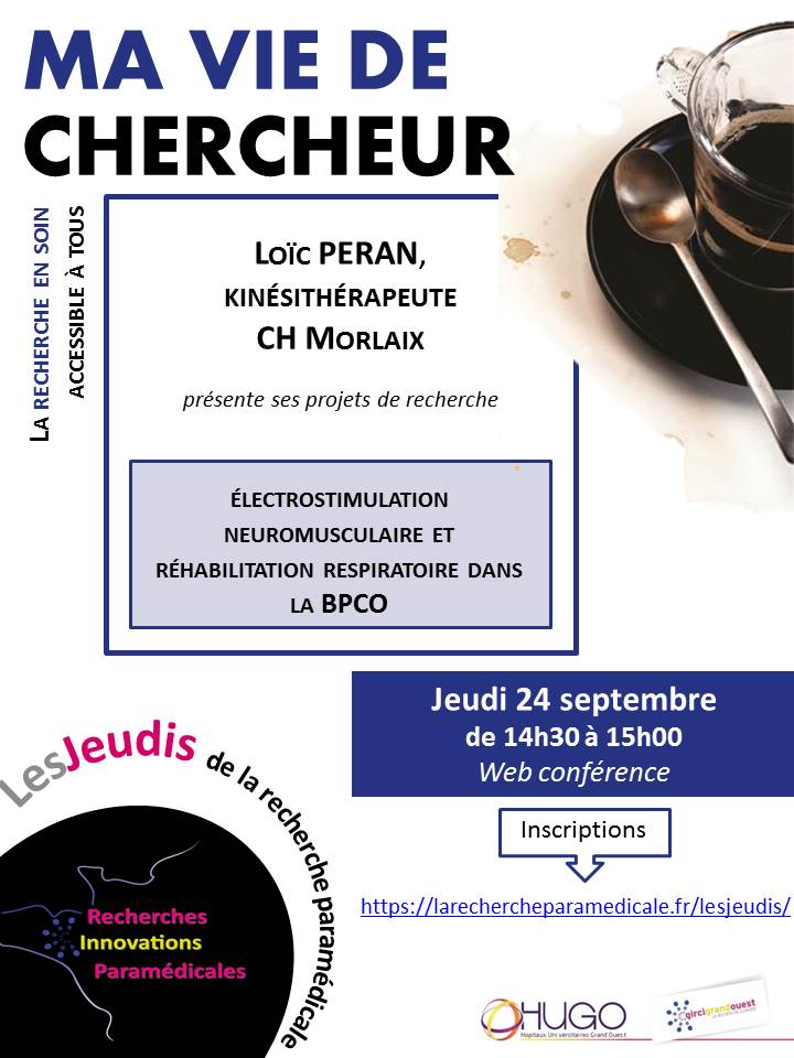 Le 15 octobre 2020, Loïc Péran, masseur-kinésithérapeute au CH du pays de Morlaix, a présenté ses projets sur le thème « Electrostimulation neuromusculaire et réhabilitation respiratoire dans la BPCO « . Une présentation « Ma Vie de Chercheur » réalisée dans le cadre des « jeudis de la recherche paramédicale » du réseau Recherches et Innovations Paramédicales du GIRCI-GO.