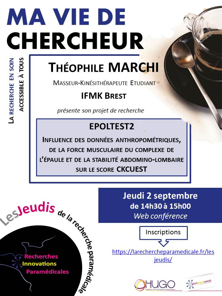 Théophile Marchi est étudiant à l’IFMK de Brest, il est le concepteur de l’étude EPOLTEST 2 s’interessant à l’Influence des données anthropométriques, de la force musculaire du complexe de l’épaule et de la stabilité abdomino-lombaire sur le score « Closed Kinetic Chain Upper Extremity Stability Test » (CKCUEST).